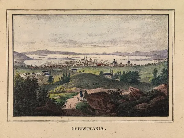 I forgrunnen to menn på en vei. Den ene sittende. den andre stående. I bakgrunnen Christiania med Vår Frelsers kirke Trefoldighetskirken Akershus og Slottet.