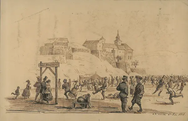 Nedenfor Akershus Festning, mennesker på skøyter, friluftsliv, islagt fjord.