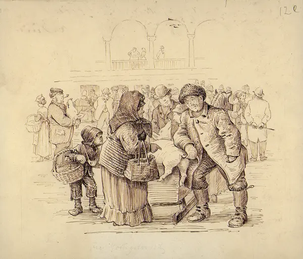folkeliv, marked, balustrade, samtale, kvinner, menn, handlekurv