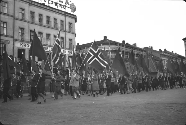Arbeiderungdommens dag, opptog, norske og røde flagg, bygårder