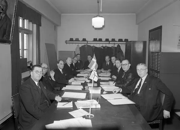 interiør, møtelokale, møtebord, menn, bordflagg, møte mellom representanter for kommuneforbundene i de nordiske lands hovedsteder, garderobe, hattehylle