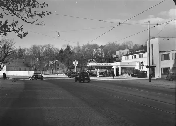 Texaco bensinstasjon, Lindviks bilverksted, veikryss, boligblokker, biler, mennesker