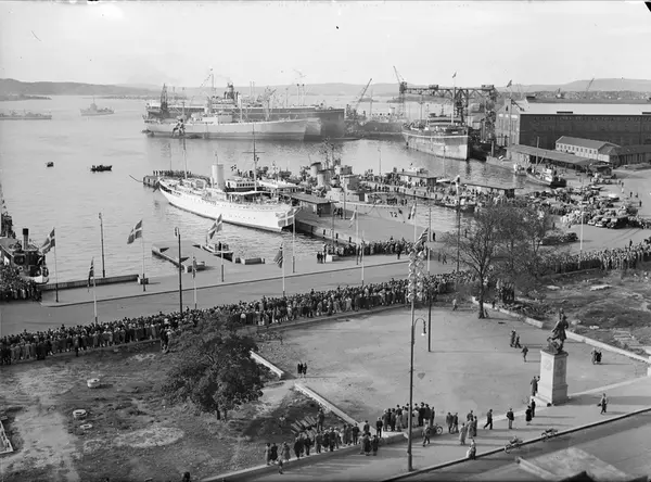 utsikt, plass, havn, fjord, kongeskip Dannebrog, eskortefartøyer, Akers mek. Verksted