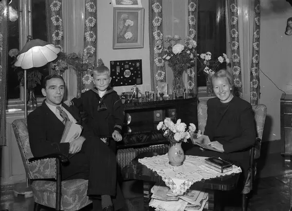 bolig, interiør, stue, familiegruppe, mann, fotballspiller, kvinne, gutt, matrosdress, idrettspremier