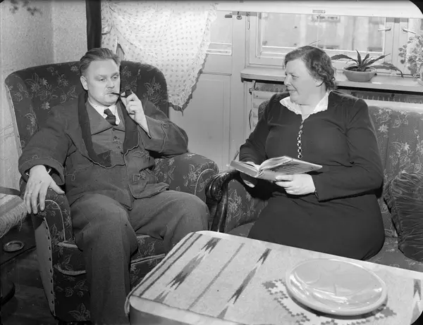 interiør, stue, ektepar, mann, pastor, reisesekretær i Blindeforbundet, piperøyking, kvinne, lesing