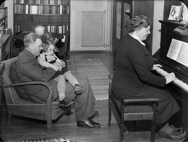 interiør, stue, mann, pastor, reisesekretær i Blindeforbundet, jente, kvinne, pianospill
