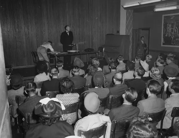 Bygningsarbeidernes Hus, interiør, møtelokale, møte i Norges handels- og kontorfunksjonærers forbund, menn, kvinner, podium, taler
