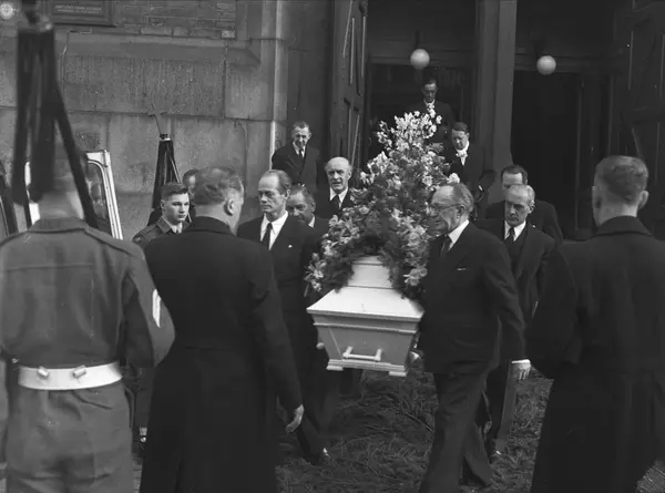 Johanne Dybwads kiste bæres ut av Trefoldighetskirken. Forrest (fra venstre) Olafr Havrevold og Joachim Holst-Jensen. Bak dem Tryggve Larsen og Harald Schwenzen, og bakerst Kolbjørn Buøen og Finn Lange.