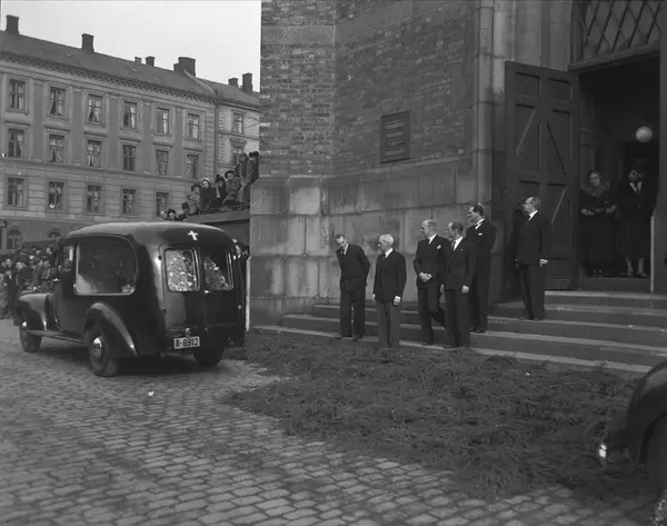 De navngitte skuespillerne er mennene på trappen, som har båret kisten ut av kirken. Bilen er en Chevrolet 1946-47.