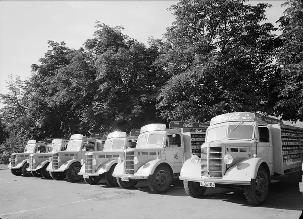 Hersleb skole, skolegård, Jarlsberg Mineralvannfabrikks bilpark, Bedford lastebiler, Coca Cola-reklame