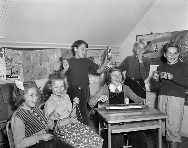 barn på skolen, jenter, gutter, musikk, rytmeinstrumenter