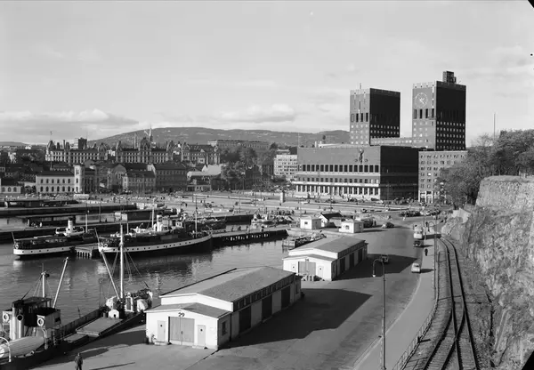 utsikt, fjord, havn, båter, Rådhuset, Vestbanestasjonen, kontorbygninger