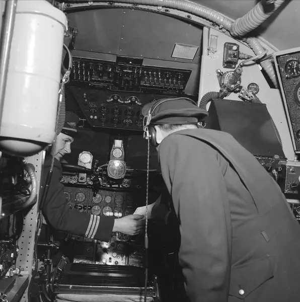 SAS, flytur Oslo - Bodø, flymaskin Dan Viking, propellfly, interiør, cockpit, menn, kaptein