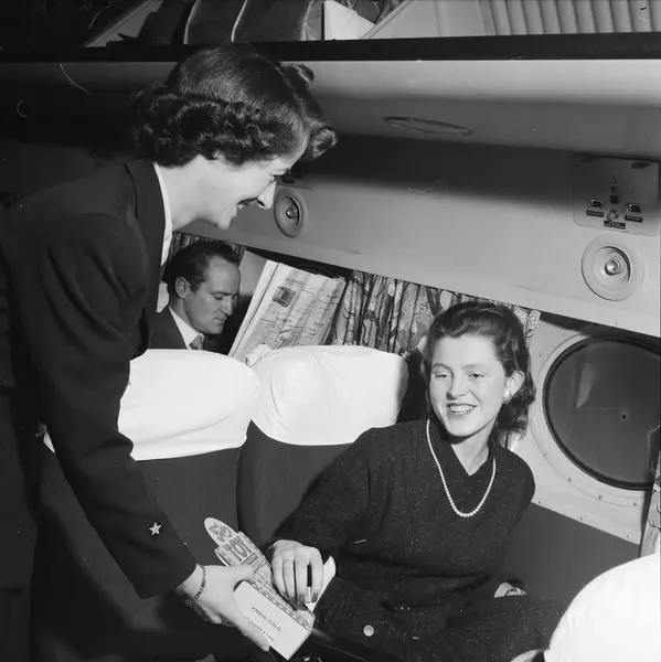 SAS, flytur Oslo - Bodø, flymaskin Dan Viking, propellfly, interiør, kabin, flyvertinne, passasjer, utdeling av Toy tyggegummi