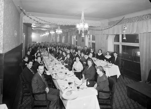 restaurant Original Pilsen, interiør, Brødrene Londons julebord, langbord, oppdekning, kvinner, menn
