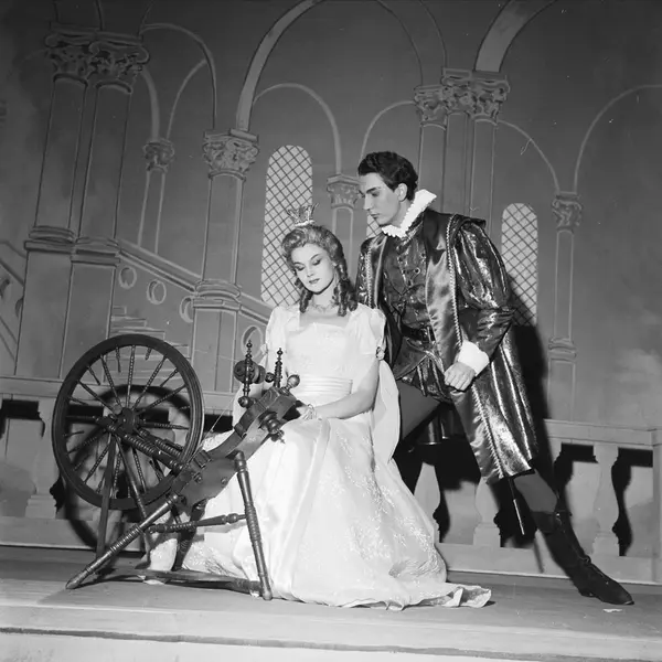 Nationaltheatret, interiør, scene, forestilling: Tornerose, kvinne, mann, skuespillere, rolle: Prinsesse Tornerose, rolle: Prins Florestan, kostymer