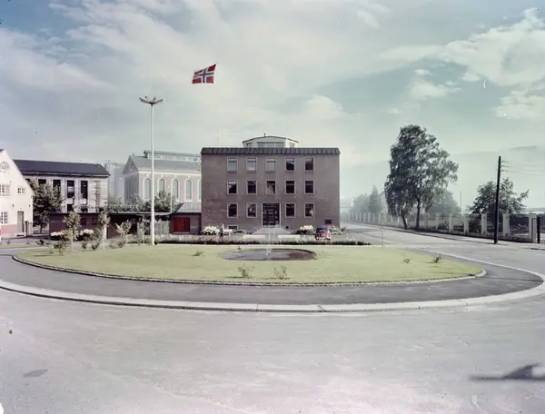 Notodden jernbanestasjon, kontorbygning, fabrikkbygninger, park, flaggstang, vei
