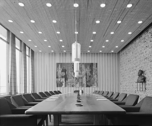 Statsrådsalen i 16. etasje. På nordveggen Hannah Ryggens bildevev "Trojansk hest" (1949/1956). På østveggen Gustav Lærums bronsebyste av Johan Sverdrup (1911).