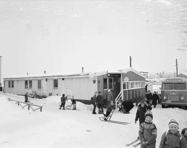 Oslo samvirkelag, avdeling Bøler, bankbuss fra Kristiania Hypotek-og Realkreditbank, kvinner, barn, lek, snø