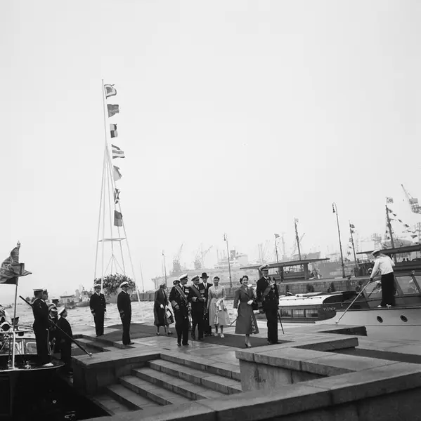 Honnørbrygga, mennesker, konge, dronning, kronprins, prinser, prinsesse, statsbesøk, ankomst, sjalupp, Akers mek. Verksted, skip