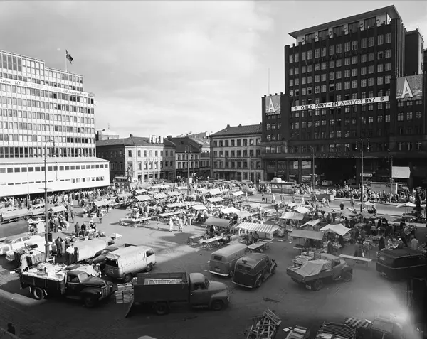 torg, torghandel, biler, mennesker, gateliv, Folkets Hus, bygårder, Folketeaterbygningen, brakke