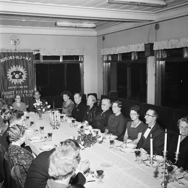 Bjerke Travbane, interiør, restaurant, oppløsning av Norsk jern- og metallarbeiderforbunds avdeling 163 ved Standard telefon- og kabelfabrikk, langbord, oppdekning, kvinner, menn