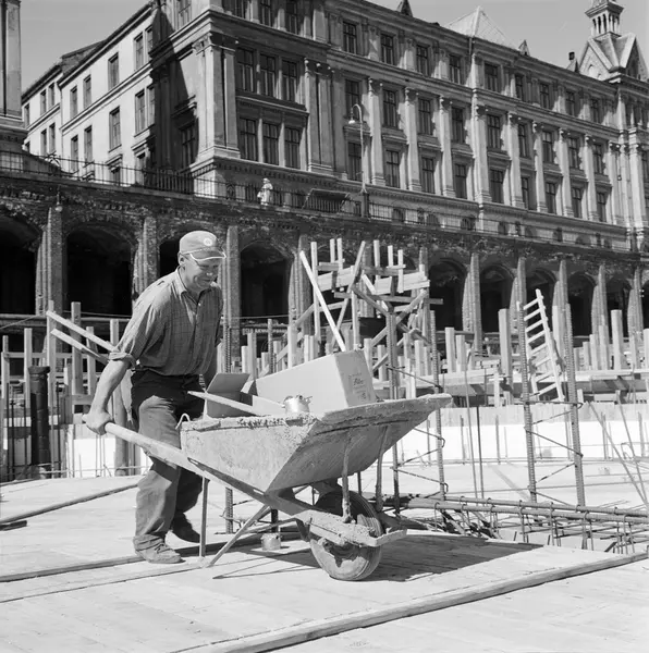 Storebrand forsikring, kontorbygning, byggevirksomhet, mann, trillebår