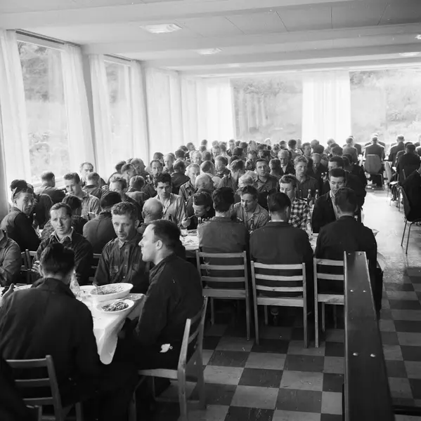 Kværner Brug, velferdsbygg, interiør, kantine, møte, menn