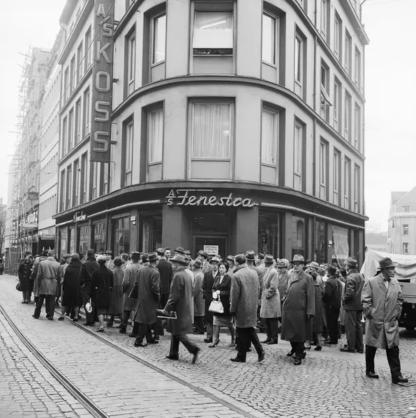 Norges handels- og kontorfunksjonærers forbund, medlemmer i streik, opptog til streikemøte i Klingenberg kino, forretningsgårder