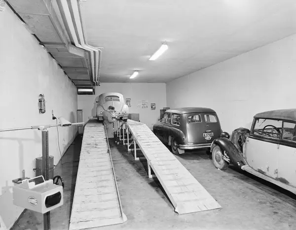 Bilene er, fra venstre: Folkevogn Boble med oval bakrute, dvs. årsmodell 1954-57, Standard Vanguard stasjonsvogn 1952 (A-12595), førkrigs Mercedes-Benz 170.