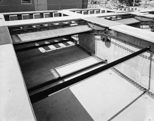 Bildet viser et sedimenteringsbasseng; et kjededrevet skrapeanlegg som samler bunnfallet (kloakkslam), og fører det til videre behandling. Vannet renner over en takkete kant og ut av bassenget.