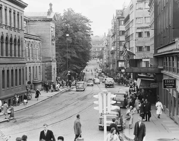 gateløp, biler, trikker, mennesker, gateliv, Nationaltheatret, forretningsgårder, Hotel Continental