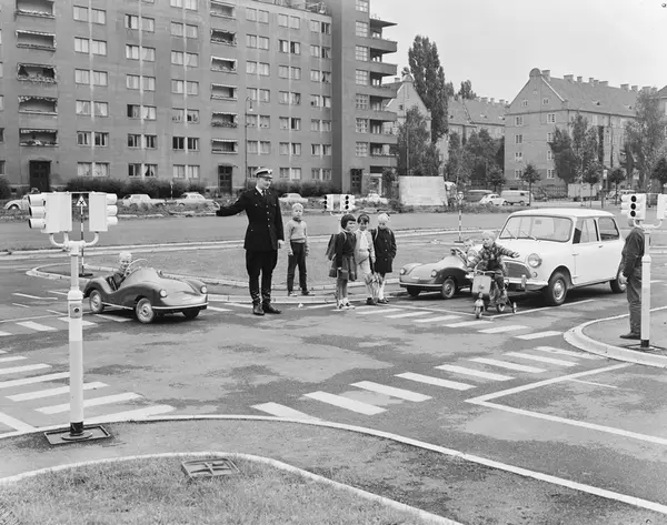 Barnas trafikkskole, barn, politimann, trafikkonstabel, biler, boligblokk