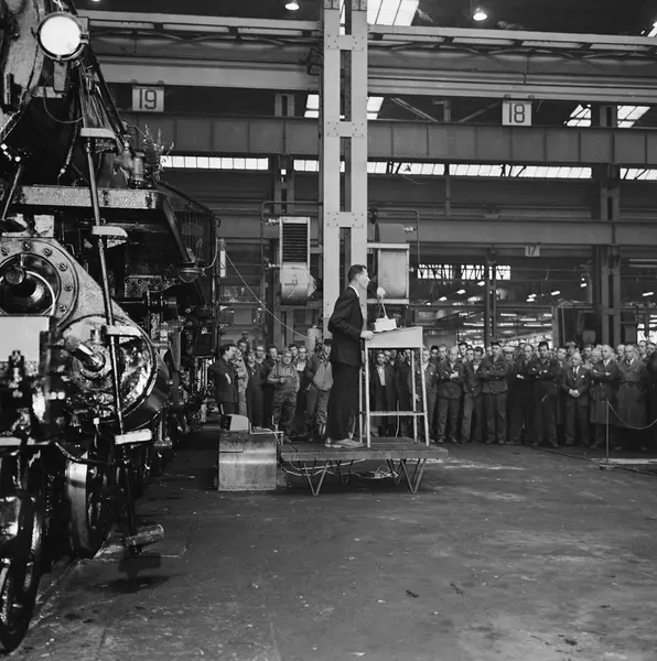 Grorud jernbaneverksted, interiør, menn, arbeidere, talerstol, damplokomotiv 215