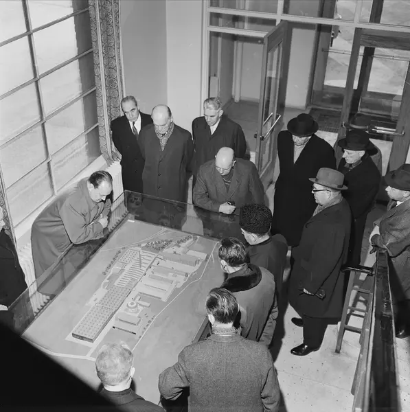 Standard telefon- og kabelfabrikk, interiør, Stortingets samferdselskomité på omvisning, menn, modell av fabrikken