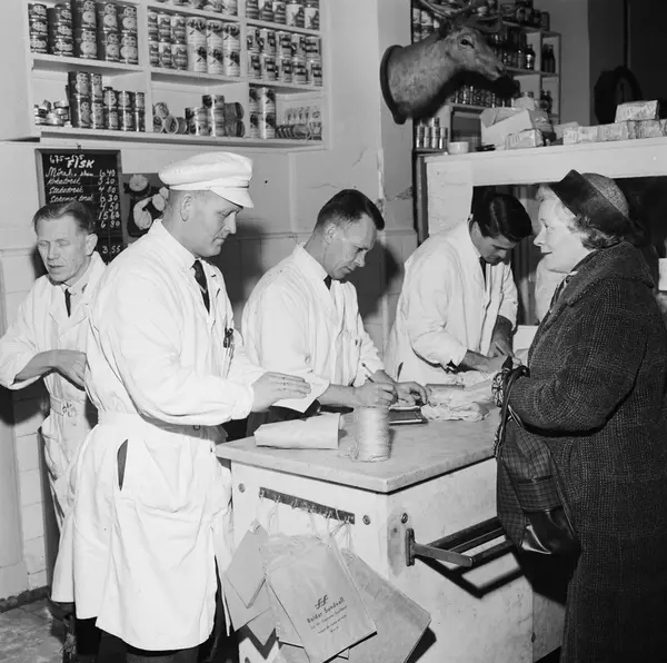 Reidar Sundvall fiskeforretning, interiør, menn, ekspeditører, kvinne, kunde