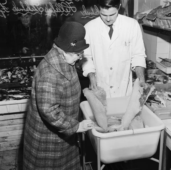 Reidar Sundvall fiskeforretning, interiør, mann, ekspeditør, kvinne, kunde