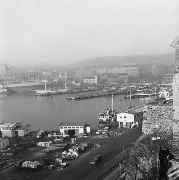 utsikt, fjord, havn, rådhusutstikkerne, seilskip, motorskip, Vestbanestasjonen