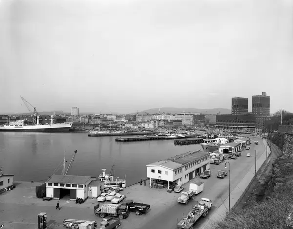 utsikt, havn, skip, lagerskur, vei, biler, Rådhuset, Vestbanestasjonen, Akers mek. Verksted