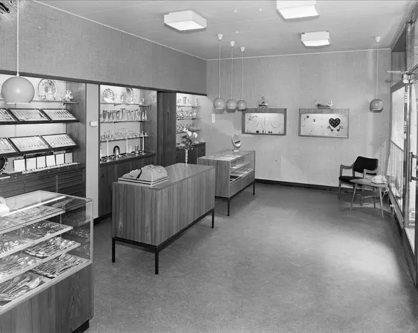 H.G. Olsens gullsmedforretning, interiør, disk, hyller, varer