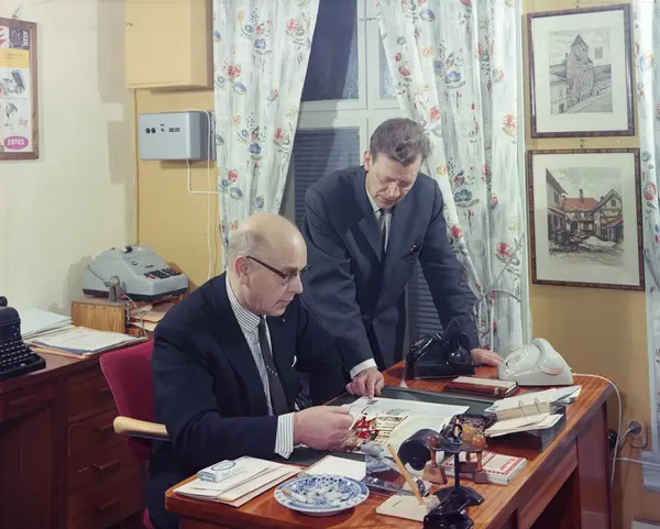Original-Trykk, trykkeri, interiør, kontor, menn, disponent, kontorsjef, sittende og stående ved skrivebord