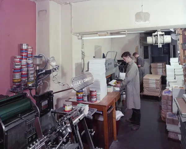 Original-Trykk, trykkeri, interiør, produksjonslokale, menn, typograflærling, trykkerilærling