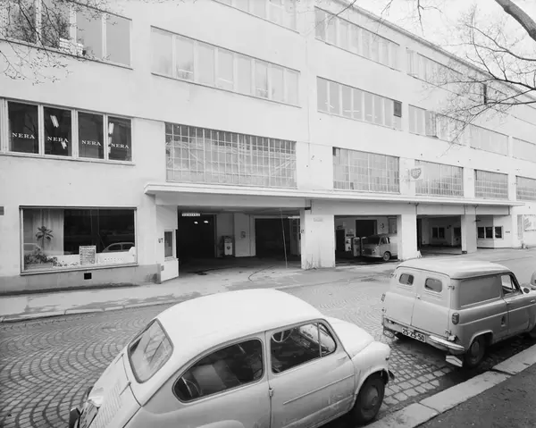 Bilen til venstre er en Fiat 600, til høyre en engelsk Ford Thames1954-59 (varebilversjonen av Anglia). Ved pumpene en tysk Ford FK 1000 kassebil.
