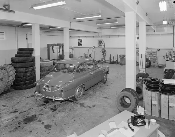 Larsen & Lund vulkaniseringsverksted, interiør, mann, bil, bildekk, pigging, gripping