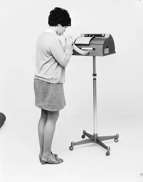 Bildet viser et apparat til å måle lungekapasitet, også kalt spirometer. Når en blåser i slangen, tegner instrumentet en kurve som viser kraften i utblåsningen.