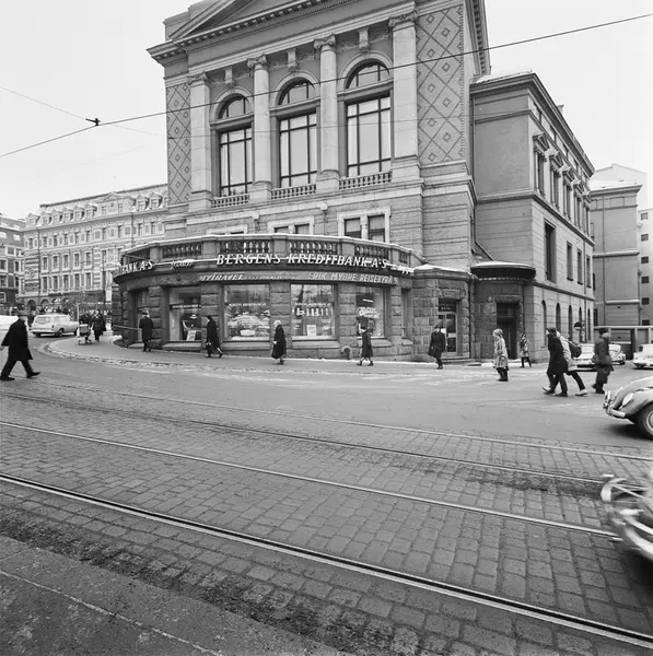 Frimurerlogen, Bergens Kreditbank, Myhres reisebyrå, mennesker, biler