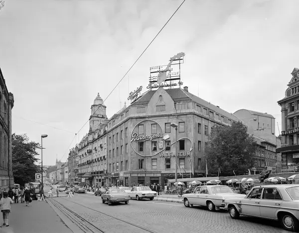 gateløp, gateliv, mennesker, biler, friluftsrestaurant, forretningsgårder, Grand Hotel, gatebelysning