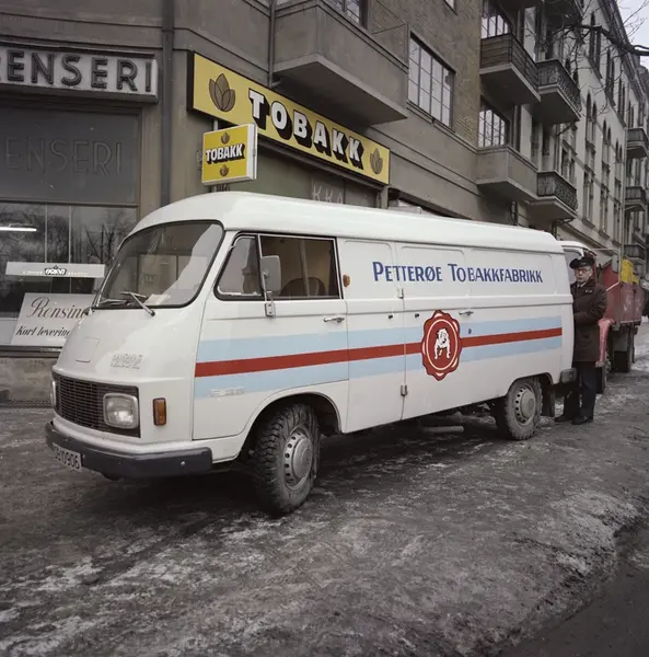 Petterøe tobakkfabrikk, varebil, reklame, mann, bygård, tobakksforretning. Orion renseri