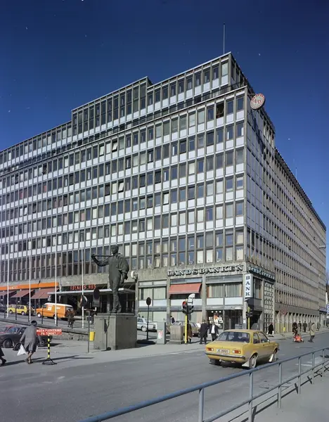 Folkets Hus, kontorbygning, Landsbanken, skulptur, biler, mennesker, gateliv