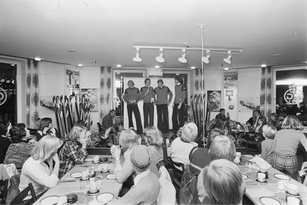 Christiania Glasmagasin, interiør, reklamearrangement for alpinsport, kafébord, gutter, jenter, kvinner, menn, alpinister, konfransier